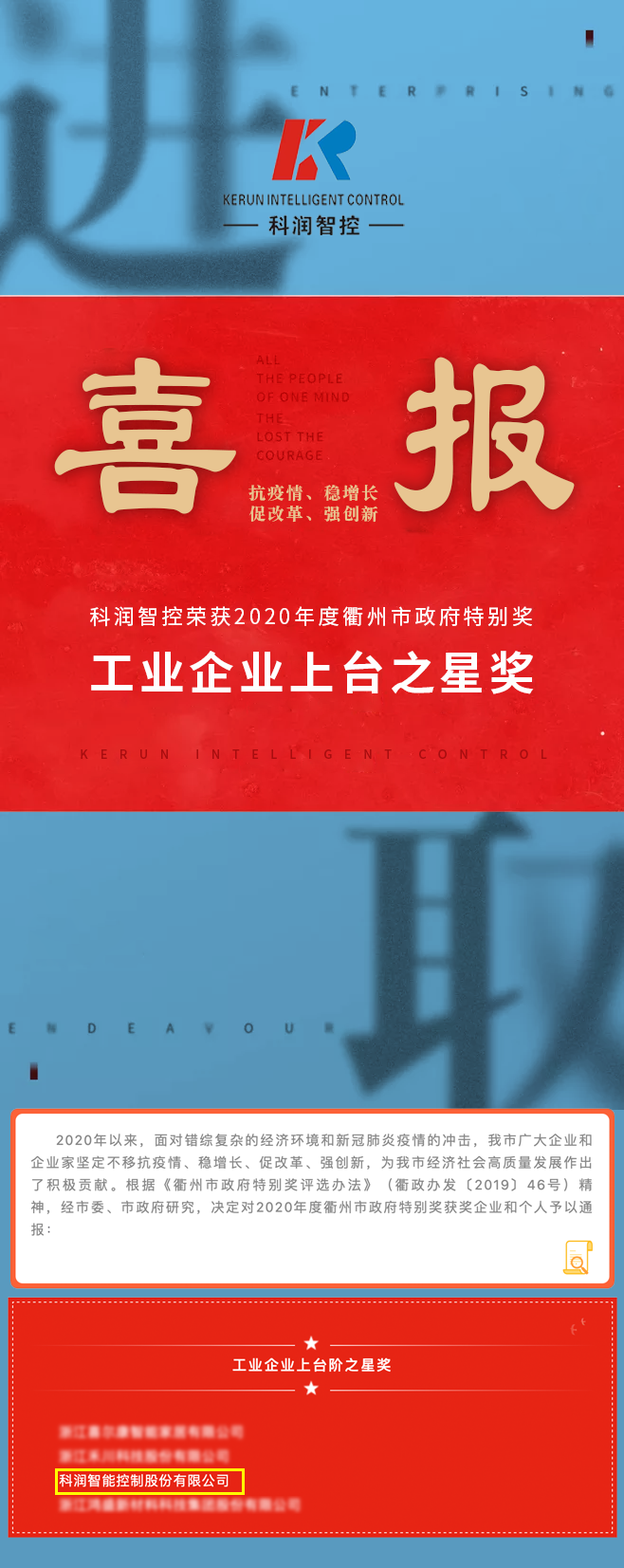 優(yōu)秀!科潤智控榮獲2020年度衢州市政府特別獎!??!