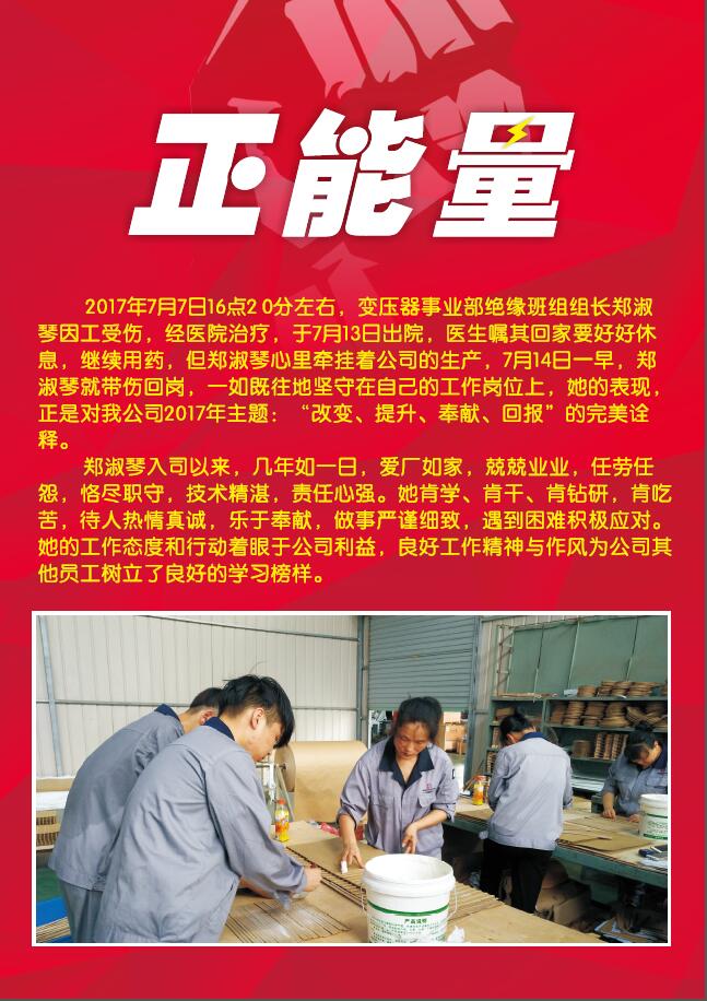 2017年77日16點(diǎn)2 0分左右,變壓器事業(yè)部絕緣班組組長鄭淑琴因工受傷,經(jīng)醫(yī)院治療,于713日出院,醫(yī)生囑其回家要好好休息,繼續(xù)用藥,但鄭淑琴心里牽掛著公司的生產(chǎn),714日一早,鄭淑琴就帶傷回崗,一如既往地堅(jiān)守在自己的工作崗位上,她的表現(xiàn),正是對我公司2017年主題:“改變、提升、奉獻(xiàn)、回報”的完美詮釋。