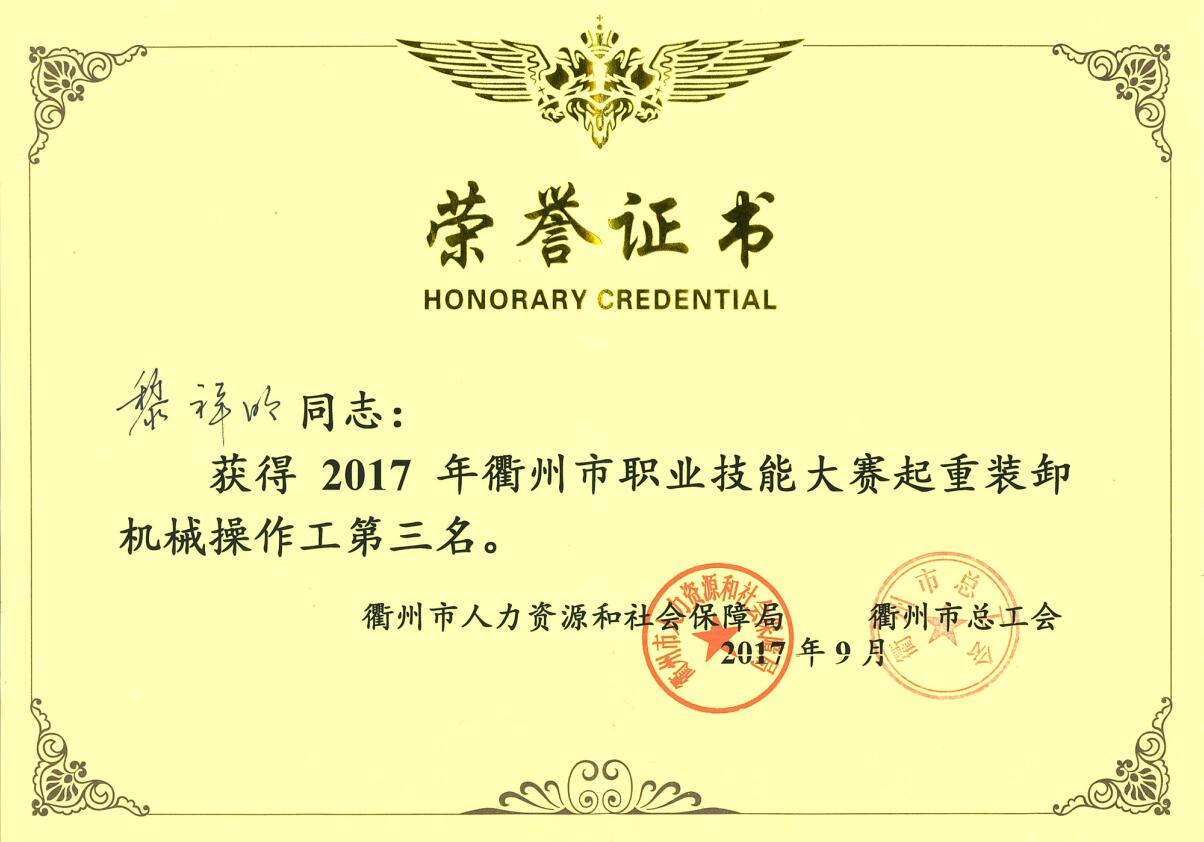 我司員工黎祥明獲得2017年衢州市職業(yè)技能大賽起重裝卸機械操作工第三名