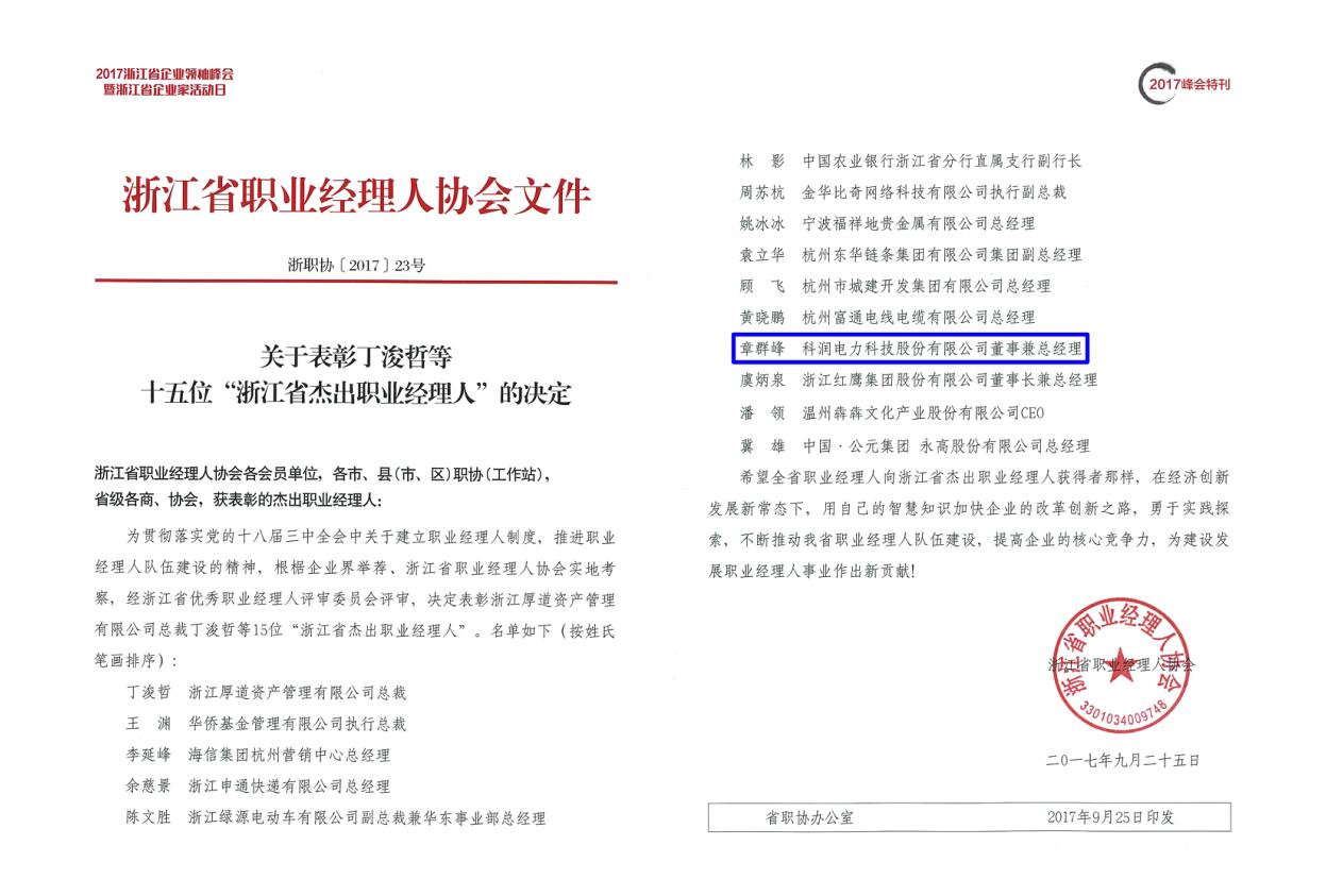 2017年度浙江省職業(yè)經(jīng)理人協(xié)會(huì)峰會(huì)暨一屆五次理事會(huì)議在杭州召開(kāi),會(huì)上揭曉了2017年度浙江省企業(yè)家“伯樂(lè)獎(jiǎng)”5名、“杰出職業(yè)經(jīng)理人”15名、 “優(yōu)秀職業(yè)經(jīng)理人”25名。我司總經(jīng)理章群峰榮獲“浙江省杰出職業(yè)經(jīng)理人”。