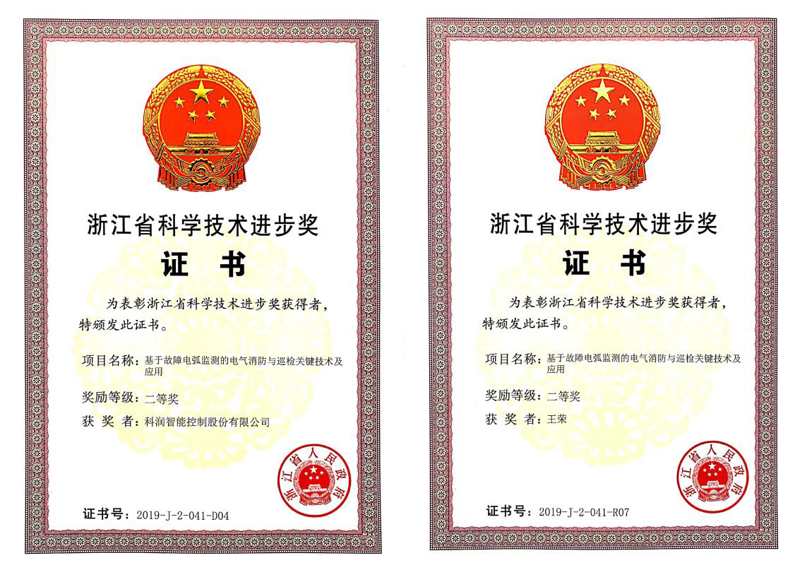 由科潤(rùn)智能控制股份有限公司與浙江某高校聯(lián)合申報(bào)的《基于故障電弧監(jiān)測(cè)的電氣消防與巡檢關(guān)鍵技術(shù)及應(yīng)用》項(xiàng)目,榮獲“2019年浙江省科技進(jìn)步二等獎(jiǎng)”,這是科潤(rùn)公司歷史上獲得的省級(jí)科技最高榮譽(yù)!這標(biāo)志著科潤(rùn)智能控制股份有限公司的科技創(chuàng)新能力再上新臺(tái)階。