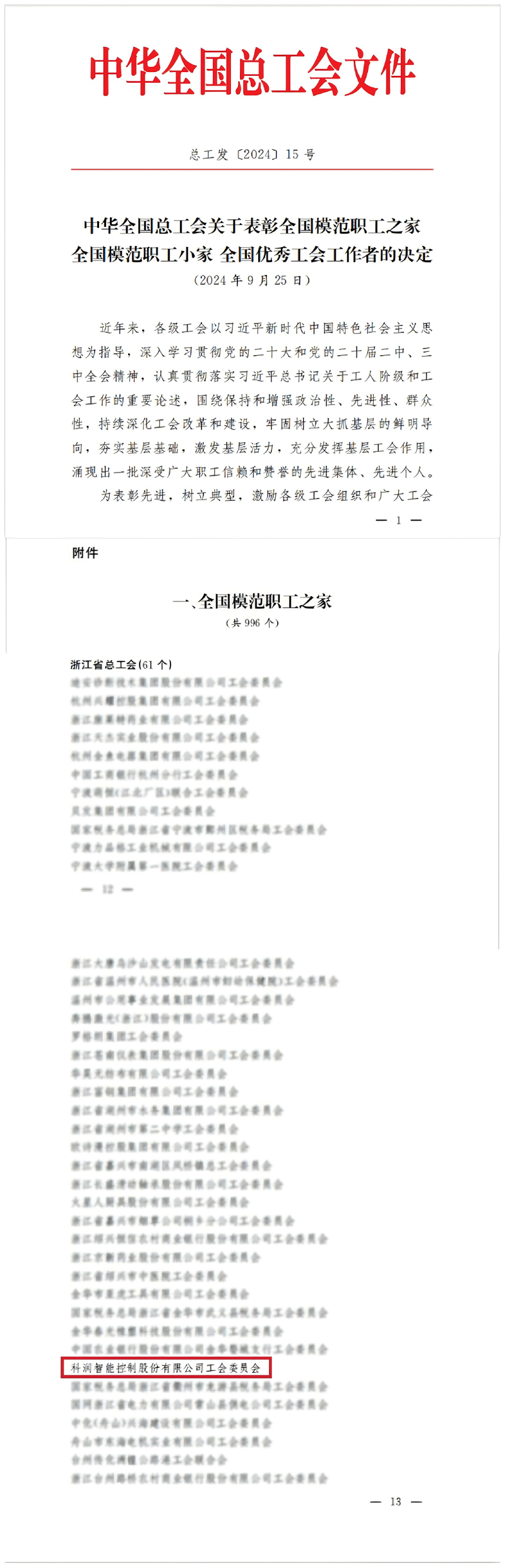 中華全國總工會辦公廳于2024年發(fā)布《中華全國總工會關(guān)于表彰全國模范職工之家 全國模范職工小家 全國優(yōu)秀工會工作者的決定》,科潤智控榮獲全國模范職工之家稱號。
